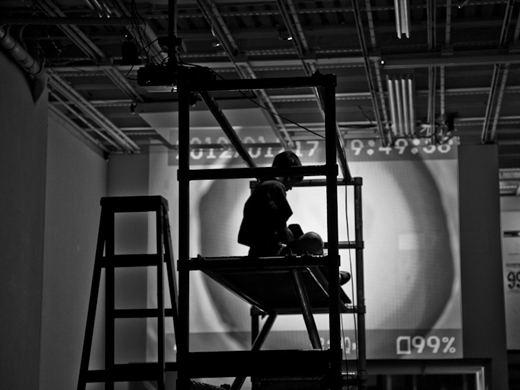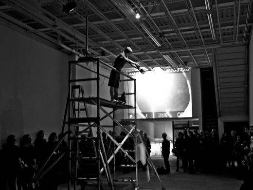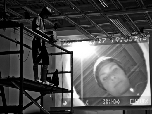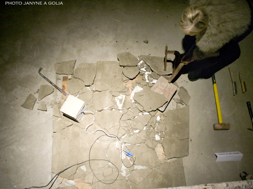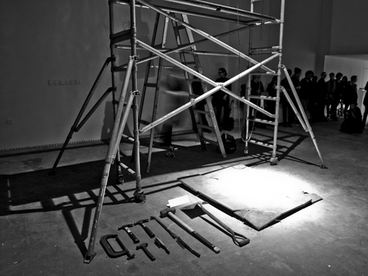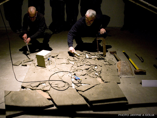 This work refers to Roberta Lima's ongoing process of interweaving her experiences as an architect and as a performer. Whereas as an architect she was trained to provide safety and the idea of shelter, as a performer she was given the chance of experimenting with the opposite: the idea of unstableness. Lima once more refers to various theories, such as of gender and bio politics, and makes use of different elements to debate the concept of displacement. The holes represent the act of invasion - once of her own body now of spaces. The cables work as a link between the bodies, the objects, and the gallery. Using movements of falling and crashing Lima creates analogies between the flow of energy in the electric cables, of the blood in bodies, and of capital in societies. Furthermore, Displacement aim to discuss the ways performance art is presented and perceived.