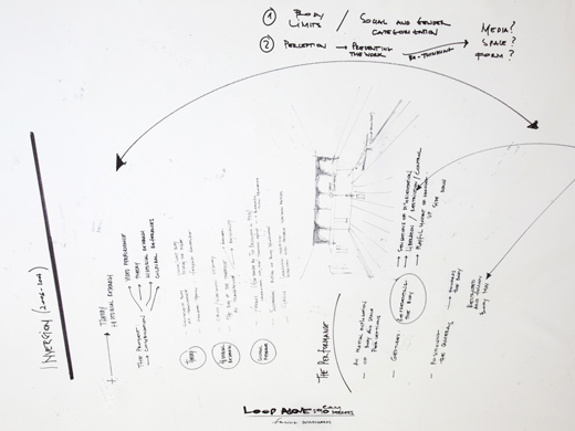 Lastly, the space of the gallery became the catalogue of the show: Through writings, lines and sketches, I guide the gallery’s visitors to comprehending how my work shifted from an intense investigation of my own body into looking at other bodies, the discovery of theory as essential for my practice, as well as the experiments with different languages and media.