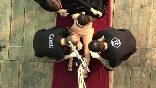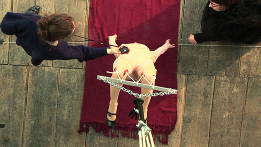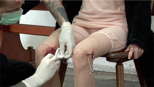 The video sequences called "going up" and "taking out" offer a general view of the performance and occupation of the space by my body, by the structures, by the cameras, and even by the rest of the people who participate on the process of this work. "Going up”, is a short edited version of the suspension. It starts by showing when the hooks got attached to the suspension structure and ends with the moment I started to make the gestures with my arms and hands while trying to adapt to the first movements in the air. "Taking out” shows the removal of the hooks and the movements of the scissors cutting the layer of the tights to clean the wounds.